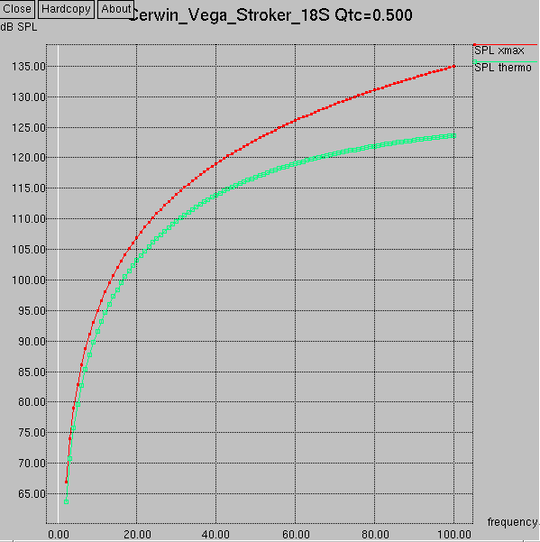 | Hz | SPL thermal | SPL xmax | Power xmax |