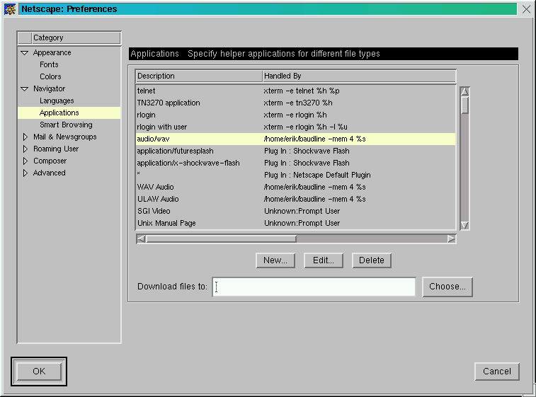 Go into Netscape's Preferences->Navigator->Applications window and edit the